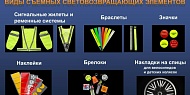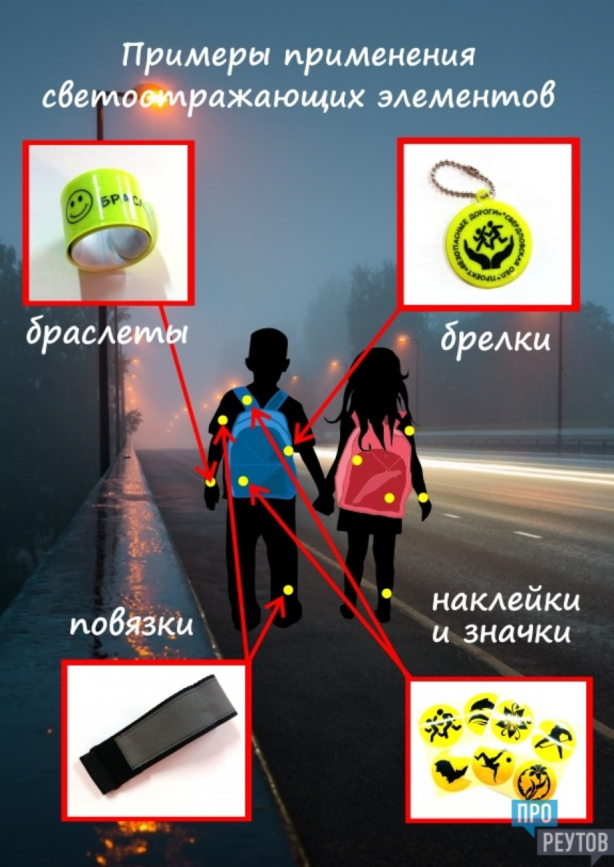 Можно использовать различные виды световозвращающих элементов – значки, браслеты, наклейки, брелоки, ленты, термоаппликации, катафоты, нарукавники на одежду и т.д.