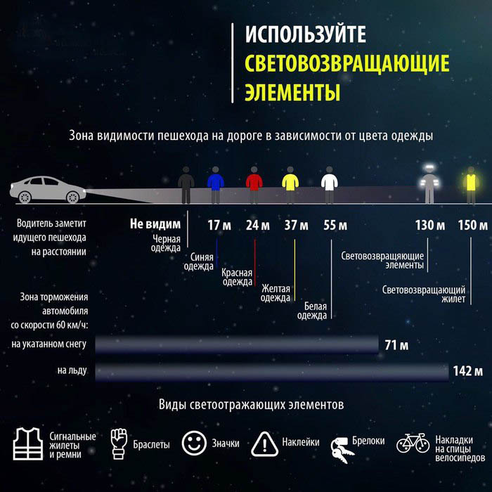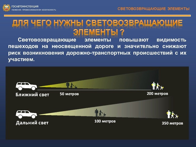 Более 90% наездов на пешеходов с тяжелыми последствиями совершается в темное время суток (вечером или ночью). Улучшение видимости пешехода становится одним из важнейших способов предотвращения дорожно-транспортных происшествий с их участием. На 70% уменьшается риск гибели для пешеходов при применении световозвращающих элементов. Световозвращающие элементы – это элементы, изготовленные из специальных материалов, обладающих способностью возвращать луч света обратно к источнику. Водитель при движении автомобиля со скоростью около 40 км/ч с использованием ближнего света фар может заметить пешехода на расстоянии около 25 метров, что не дает ему возможности успеть затормозить и избежать наезда. Если пешеход использовать световозвращающие элементы, то водитель имеет возможность заметить его с расстояния, превышающего 150 метров.
